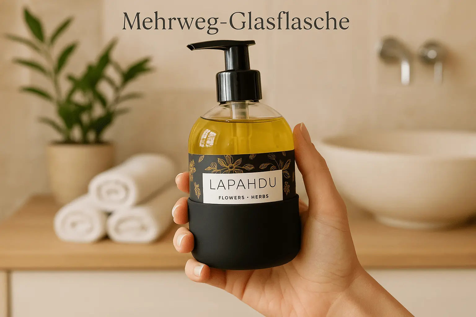 Die Schutzhülle kann ganz einfach über die Flasche gestülpt werden. Wenn die Seife leer ist, ziehst du den Silikonmantel wieder ab und benutzt ihn für deine neue LAPAHDU-MEHRWEG-Flasche.